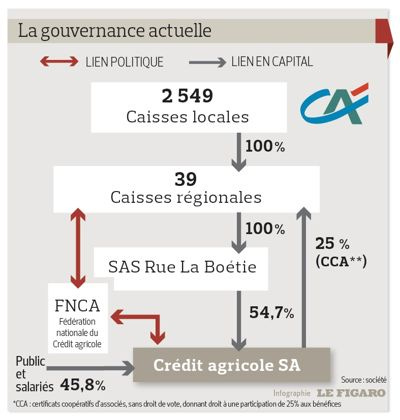 À la base, 2 549 Caisses locales regroupent 12,1 millions de sociétaires (à la fois clients et détenteurs du capital). Au-dessus, 39 Caisses régionales, véritables entités opérationnelles agréées comme établissements de crédit, détenues par les Caisses locales. Au sommet, Crédit Agricole S.A. (CASA), société anonyme cotée au CAC 40, détenue à 56,5% par les Caisses régionales via la holding SAS Rue La Boétie.