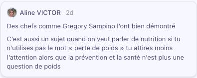 (…) C'est aussi un sujet quand on veut parler de nutrition si tu n'utilises pas le mot « perte de poids » tu attires moins l'attention alors que la prévention et la santé n'est plus une question de poids. - Aline Victor, nutritionniste