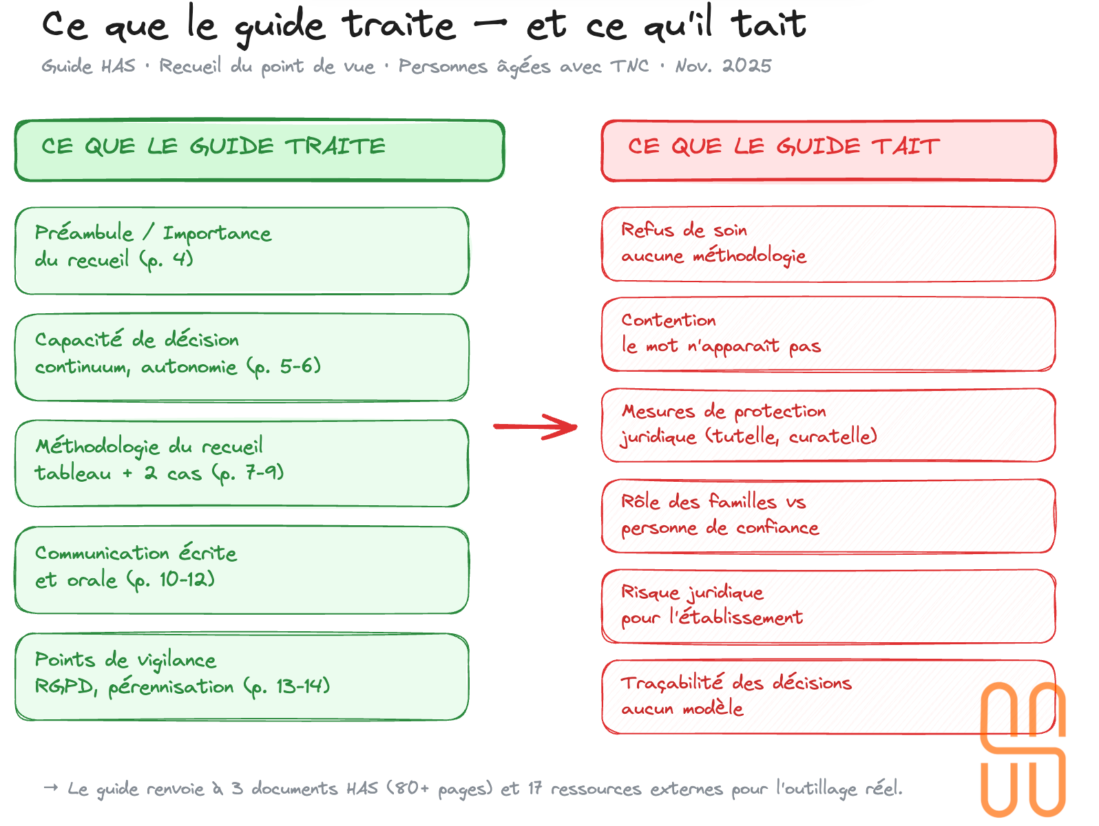 L’écart entre la promesse et la livraison est net. Pas d’arbre décisionnel, pas de grille de recueil prête à l’emploi, pas de processus étape par étape, pas de modèle de traçabilité. Le guide renvoie explicitement à d’autres documents pour la mise en œuvre concrète : « Les caractéristiques, mises en œuvre et limites des différentes méthodes sont présentées dans le guide méthodologique HAS 2023, p. 12-17 » (p. 8). C’est un méta-guide : un document d’orientation qui pointe vers d’autres documents pour l’outillage réel.