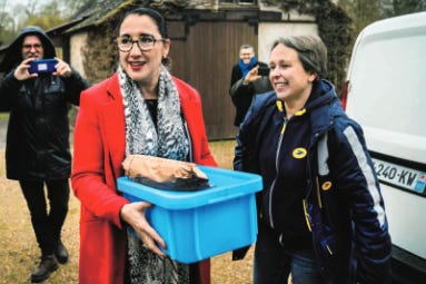 Illustrant l’article, deux photos. Un portrait “studio” où la ministre pose en tailleur d’un rouge éclatant. Une scène “volée” où elle fait la promotion du nouveau service de portage de repas opéré par La Poste…