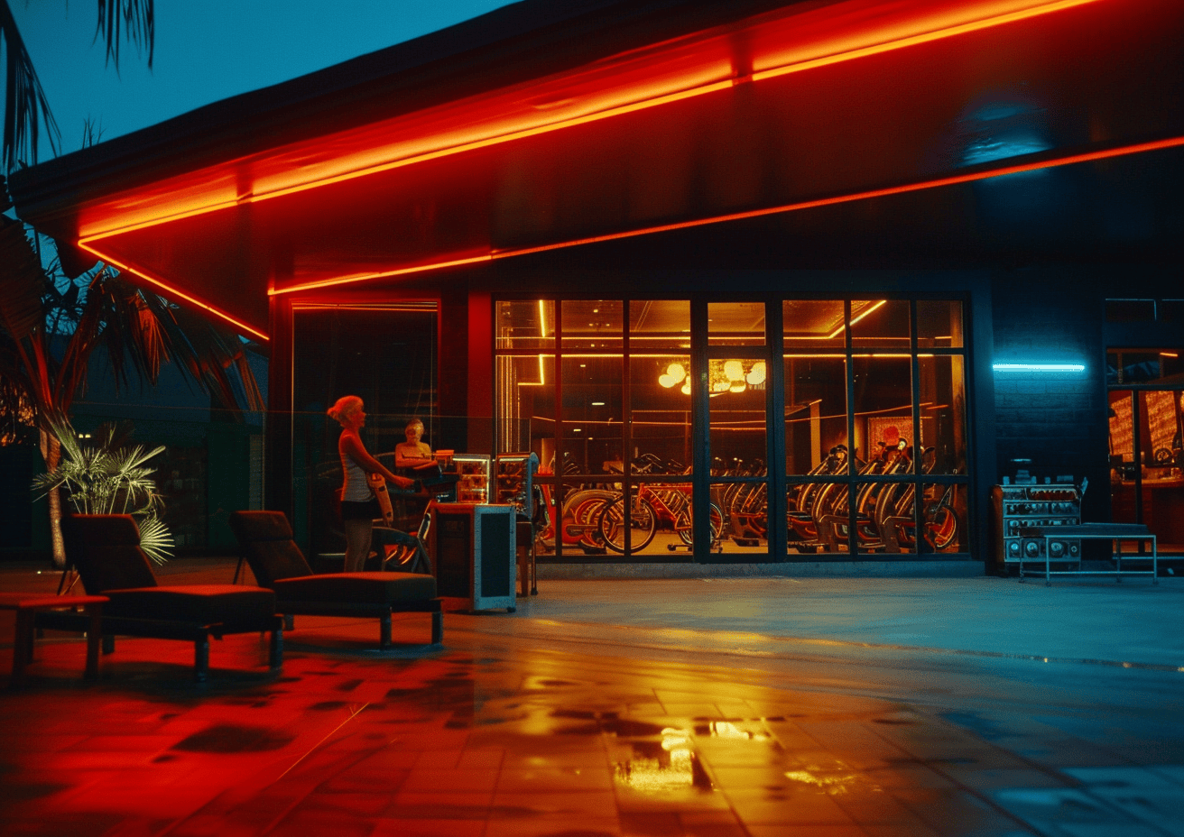 Un bureau de poste traditionnel se reflétant dans un miroir déformant. Dans le reflet, le bureau de poste apparaît comme un centre de bien-être sophistiqué, avec des seniors faisant du yoga, recevant des soins médicaux et participant à des ateliers de santé.